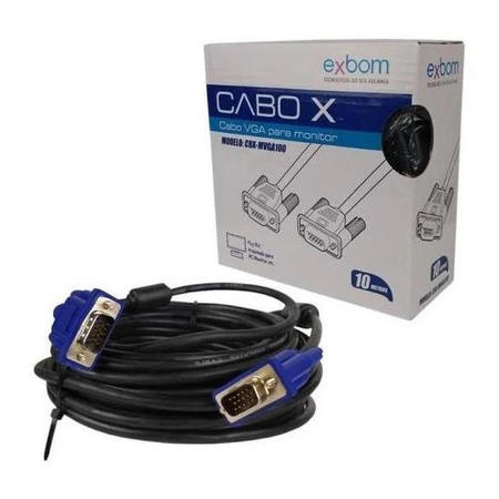 Especificações: Conectores VGA 15 pinos Comprimento do cabo: 10m Indicado para conectar computadores, monitores (RGB) e outros aparelhos com entrada VGA Revestimento emborrachado de alta qualidade Conector em metal inoxidável Compatível com as Resoluções: Vga 640x350/ Svga 800x600/ Sxvga 1280x1024